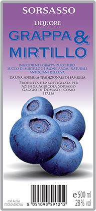Sorsasso produce questa specialità tipica del territorio utilizzando la propria grappa bianca in un infuso di mirtillo. Questo prodotto ha un grado alcolico di 28%Vol. Ottimo come fine pasto, ma anche come aperitivo servito con ghiaccio.
