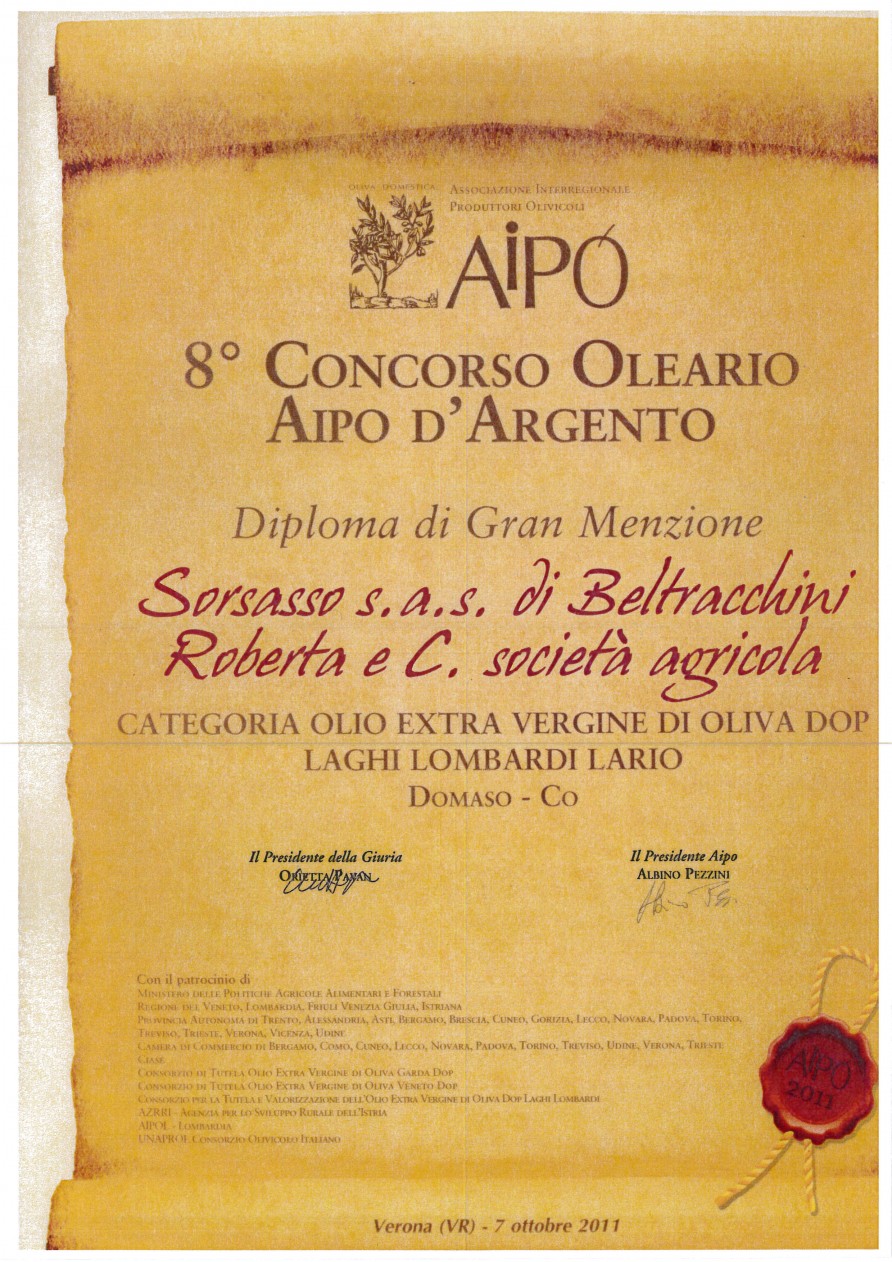 L’ Azienda Sorsasso produce anche olio extravergine di oliva DOP, ottenuto dagli ulivi di proprietà coltivati nella zona collinare di Domaso con olive di frantoio leccino e pendolino.